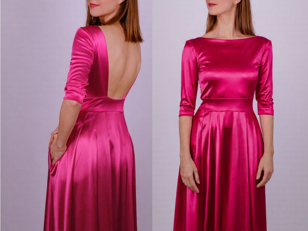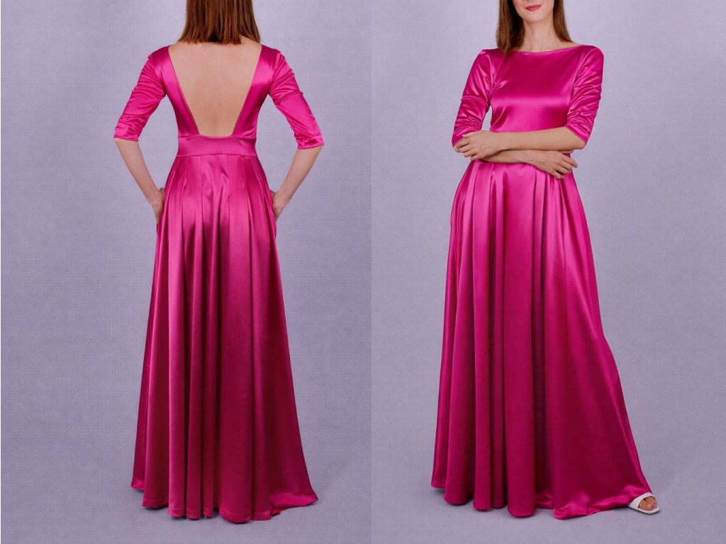 Príjemné, splývavé, prispôsobivé, elastické šaty. Materiál v trupovej časti zdvojený, kvôli komfortu nosenia. Ak sa ale na nosenie bez spodného prádla necítite, odporúčali by sme nosiť pod šatami nalepovaciu podprsenku. Výrazný výstrih na zadnom diely. ¾ rukáv. Majú praktické vrecká a maxi sukňu so záhybmi.