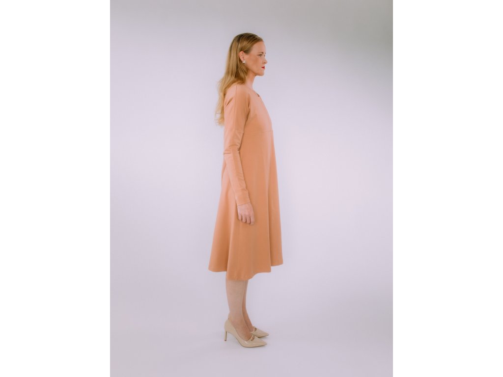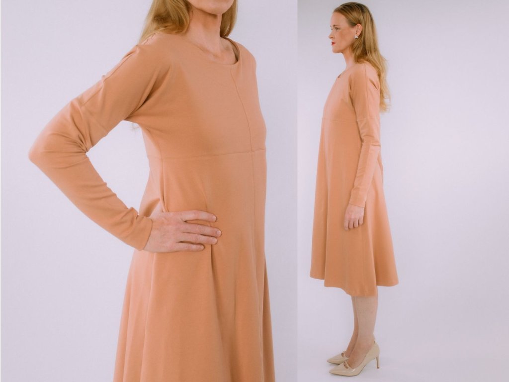 Pohodlie, ktoré si okamžite zamilujete. Šaty HANA sú ušité z príjemnej elastickej teplákoviny – mäkkej, hrejivej a ideálnej na jeseň aj zimu. Vďaka dlhým rukávom a midi dĺžke sú univerzálnym kúskom, ktorý využijete na každodenné nosenie aj pracovné stretnutia.