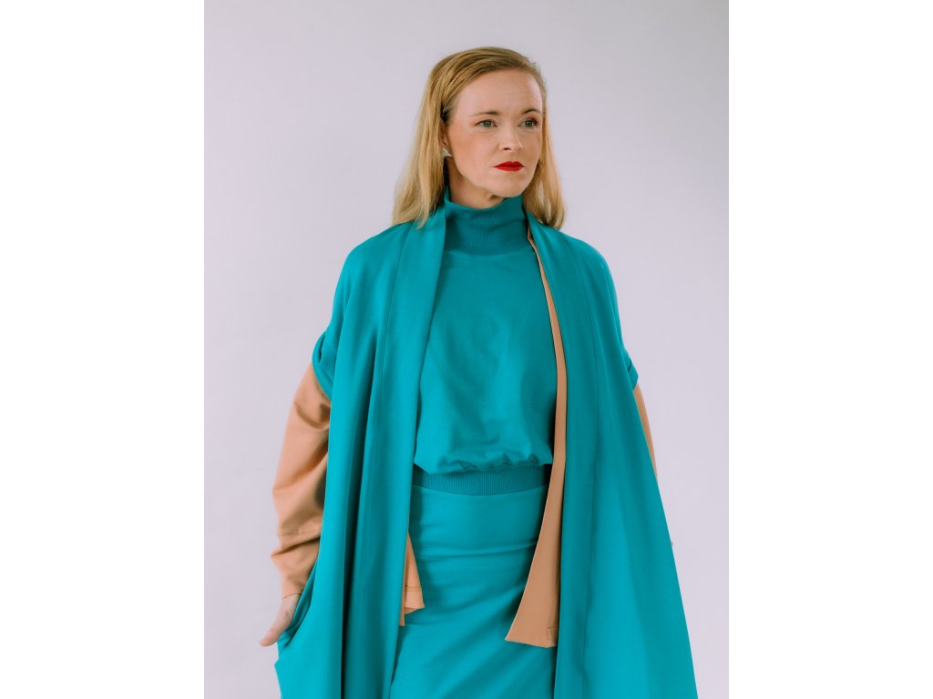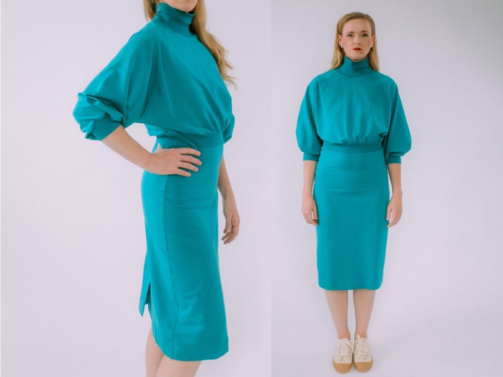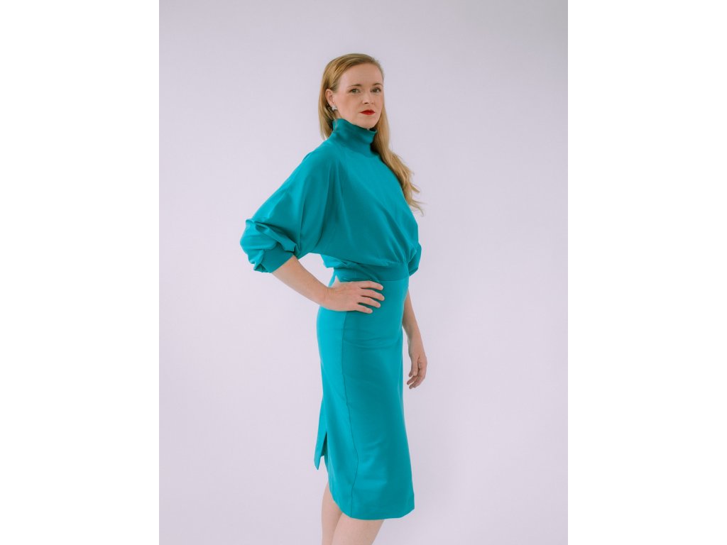 Majú prinechané ¾ rukávy, ktoré sú zakončené elastickým patentom v rovnakej farbe. Rovnaký detail nájdete aj v páse – jemne zvýrazní líniu a dodá šatám lichotivý tvar. Ozdobným prvkom je aj rolákový golier z elastického patentu, ktorý pôsobí elegantne a zároveň prakticky. Sukňová časť je doplnená o decentný rozparok na zadnom diele, vďaka čomu šaty pôsobia žensky a pohodlne pri pohybe.