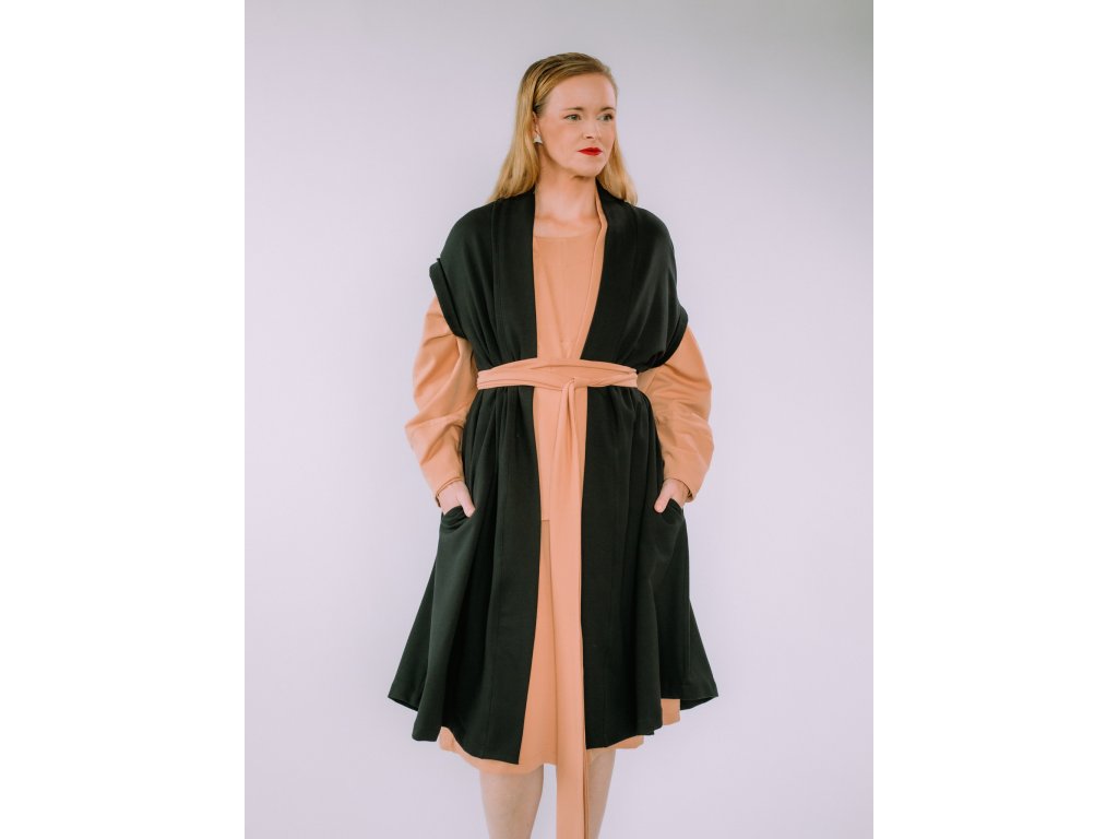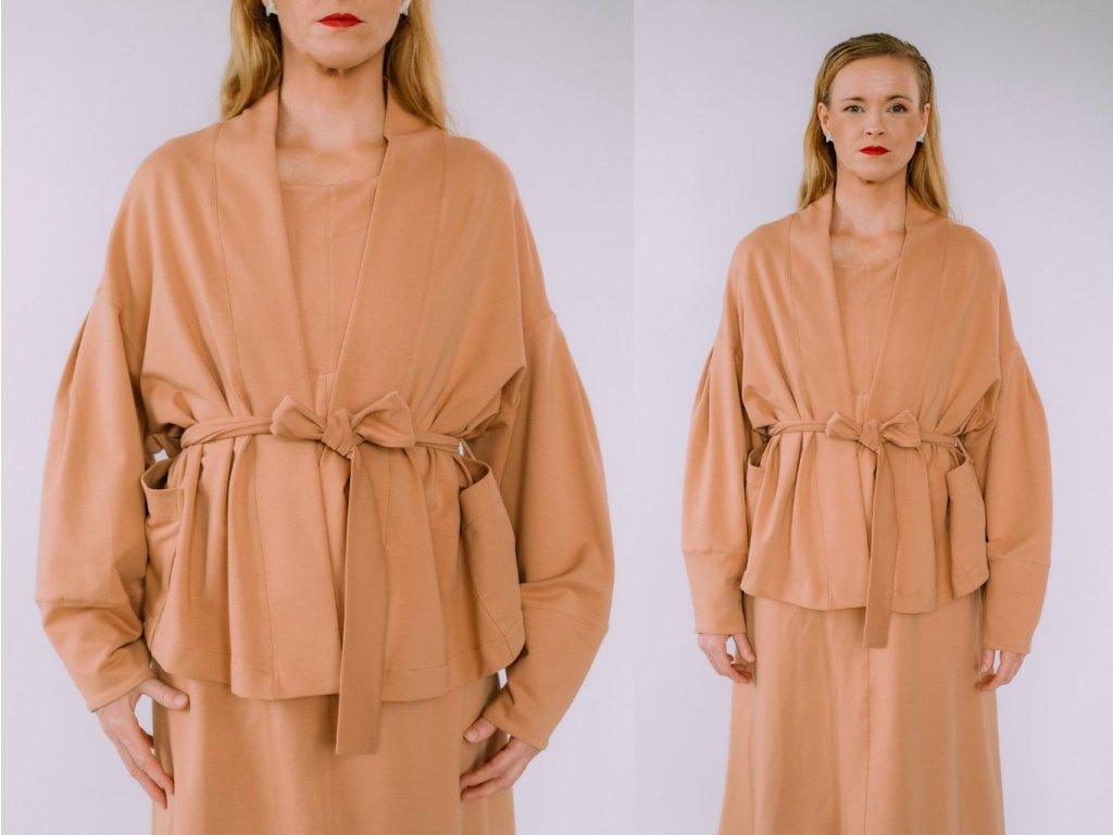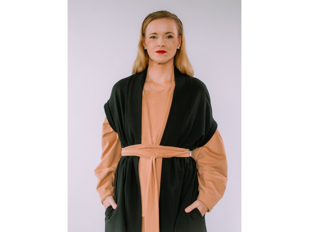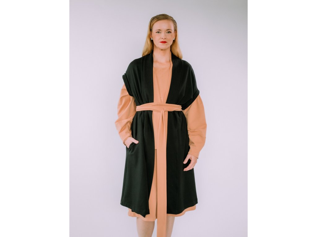 Univerzálny, nadčasový a praktický kúsok, ktorý si zamilujete. Kardigan Vera je ušitý z elastickej teplákoviny a vďaka premyslenému strihu ponúka viac možností nosenia – môžete ho nosiť voľne, previazaný opaskom (ktorý je súčasťou) alebo ako extra vrstvu pod kabát. Vďaka výrazným nakladaným vreckám a originálnym rukávom pôsobí moderne a štýlovo. Je to slow fashion kúsok, ktorý využijete počas celého roka: