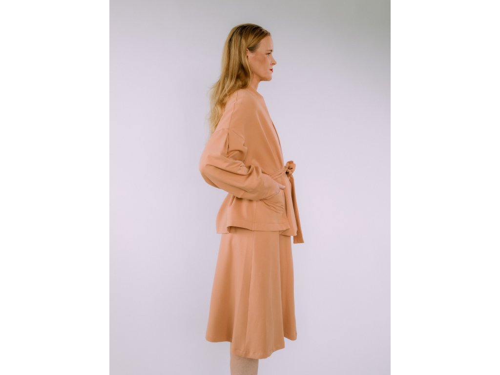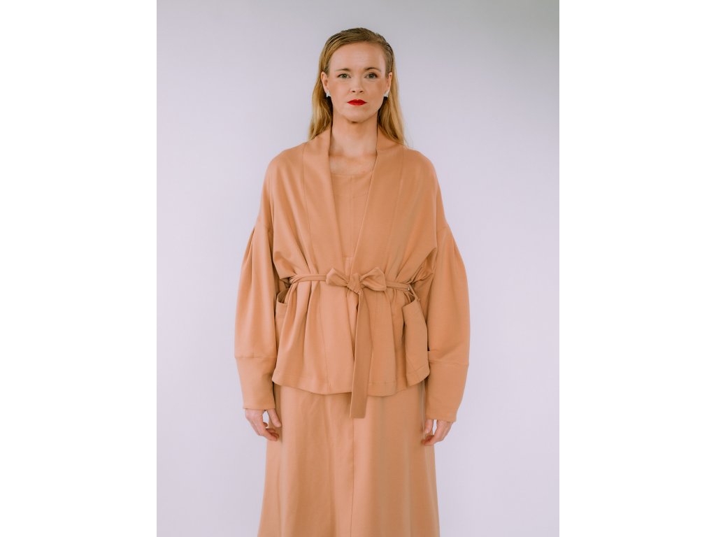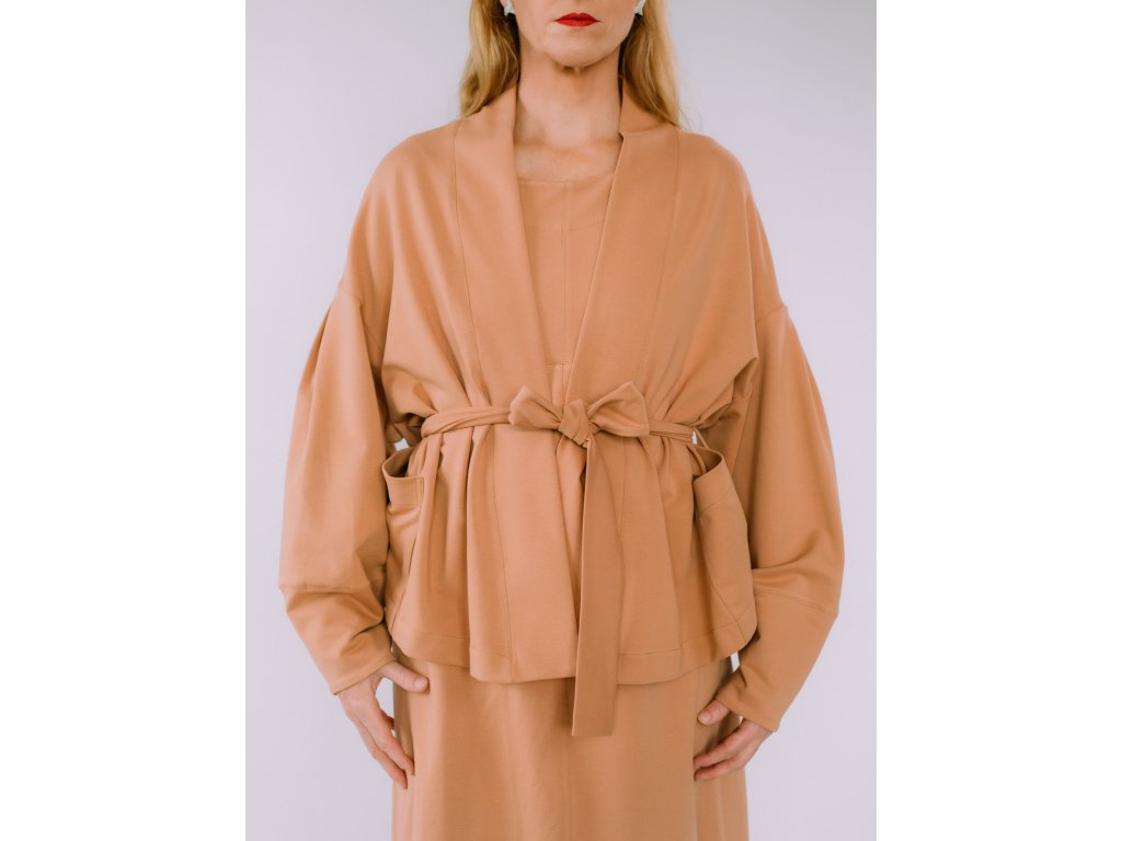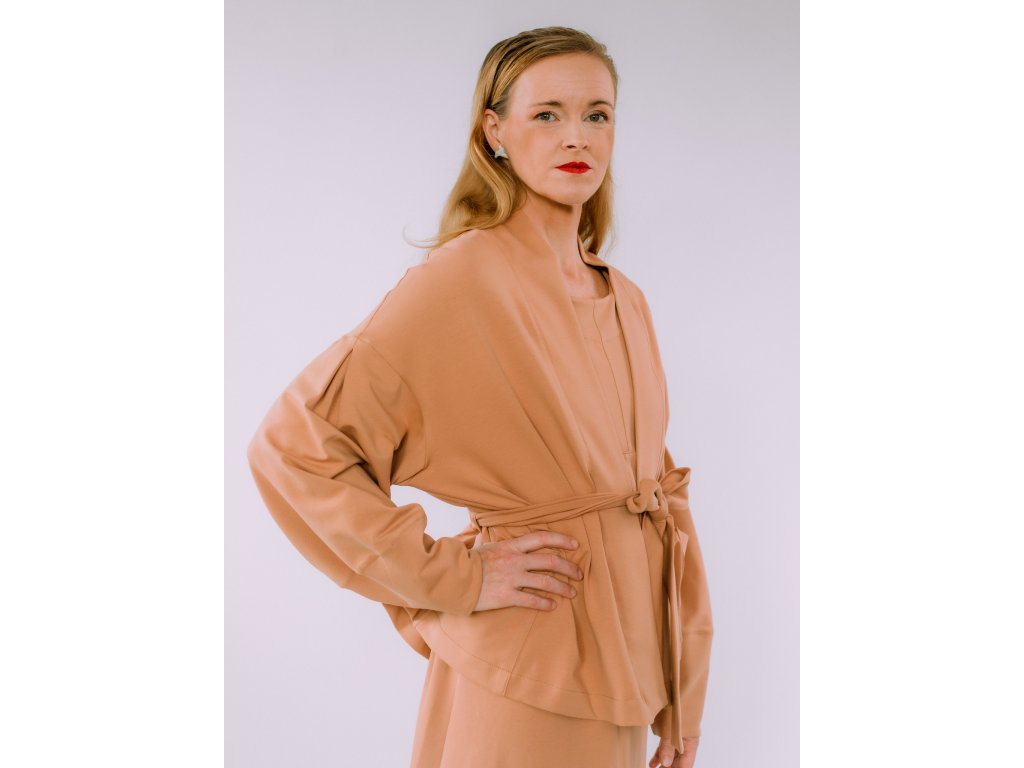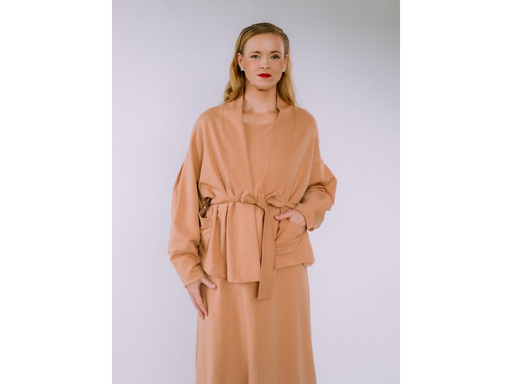Univerzálny, nadčasový a praktický kúsok, ktorý si zamilujete. Kardigan Vera je ušitý z elastickej teplákoviny a vďaka premyslenému strihu ponúka viac možností nosenia – môžete ho nosiť voľne, previazaný opaskom (ktorý je súčasťou) alebo ako extra vrstvu pod kabát. Vďaka výrazným nakladaným vreckám a originálnym rukávom pôsobí moderne a štýlovo. Je to slow fashion kúsok, ktorý využijete počas celého roka: