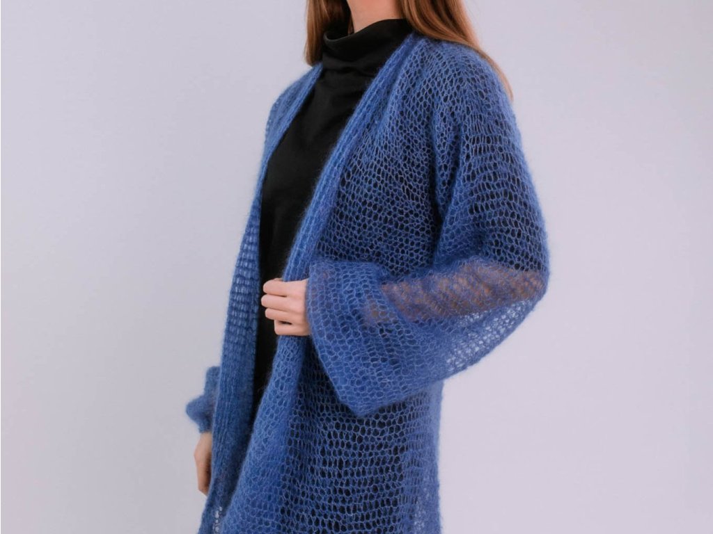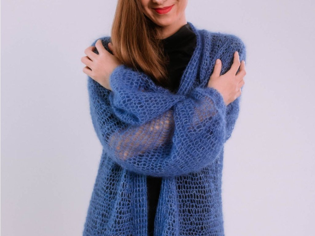 RUČNE PLETENÝ MOHÉROVÝ KARDIGÁN TEDD (MODRÝ) | MIESTNI