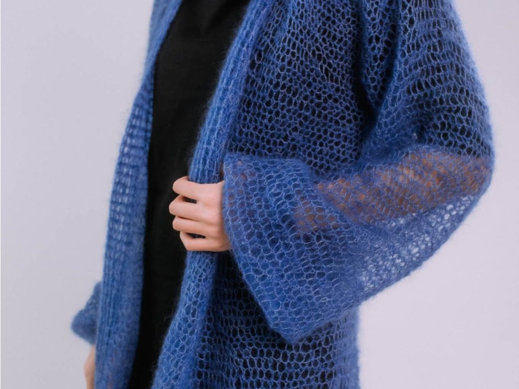 Ručne pletený mohérový kardigán z exkluzívnej zmesi mohéru a morušového hodvábu. Nadýchaný, ľahký a mimoriadne jemný úplet pôsobí vzdušne a elegantne. Voľný strih s možnosťou previazať v páse vytvára ženskú siluetu a ponúka komfort pri nosení. Nadčasový kúsok, ktorý dodá outfitu jemnosť a luxusný dotyk.