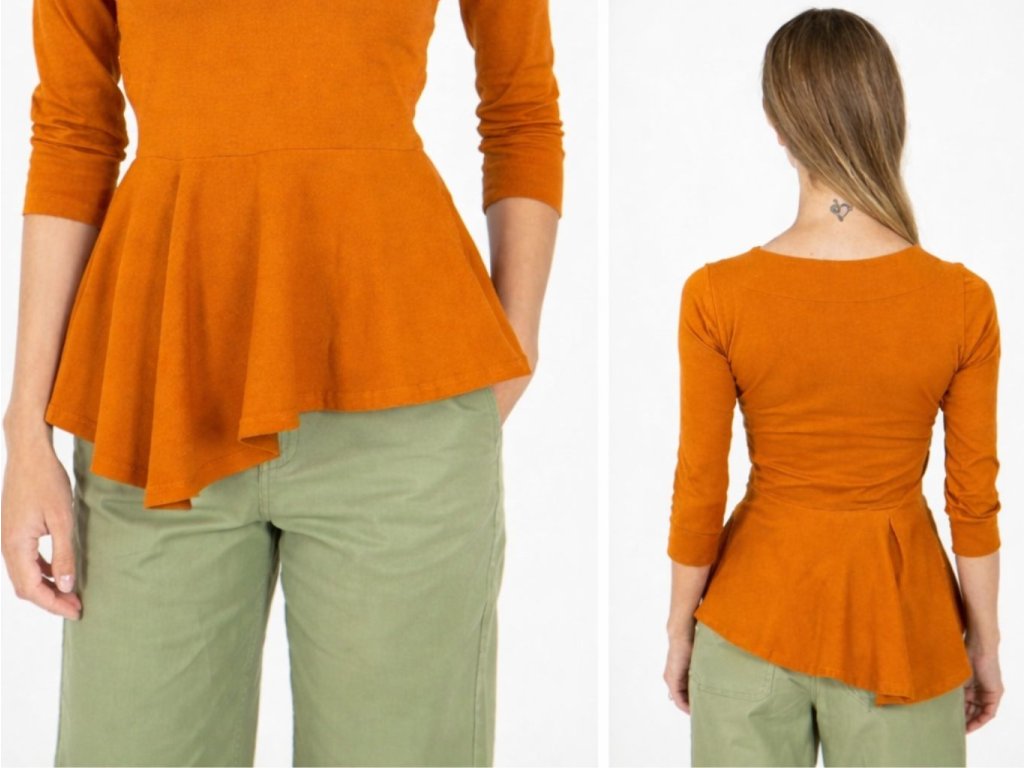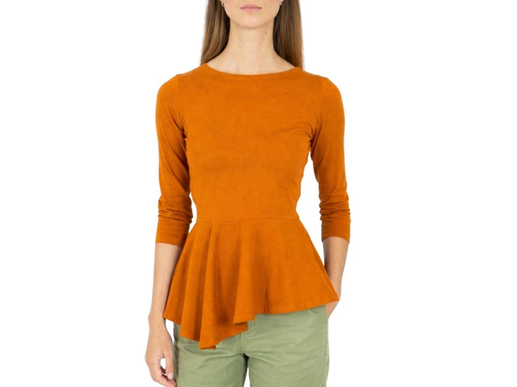Toto bavlnené elastické tričko je dokonalým kúskom do kapsulového šatníka. Má klasický výstrih, lichotivý asymetrický strih s volánom od pása dole a elegantné ¾ rukávy s manžetou. Je navrhnuté tak, aby poskytovalo maximálne pohodlie a zároveň pôsobilo štýlovo a nadčasovo.