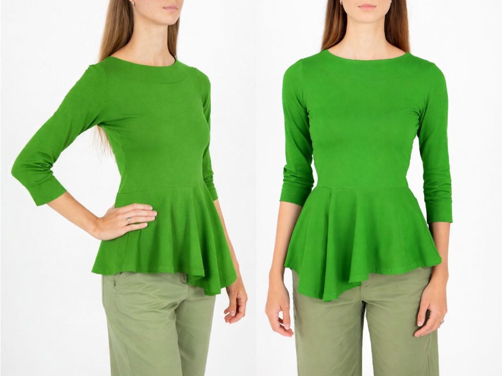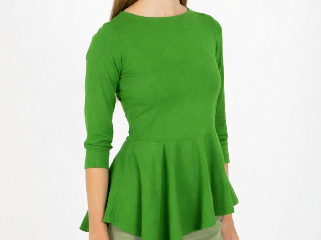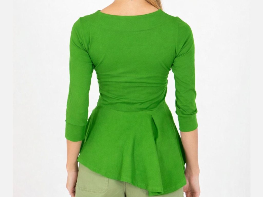 Toto bavlnené elastické tričko je dokonalým kúskom do kapsulového šatníka. Má klasický výstrih, lichotivý asymetrický strih s volánom od pása dole a elegantné ¾ rukávy s manžetou. Je navrhnuté tak, aby poskytovalo maximálne pohodlie a zároveň pôsobilo štýlovo a nadčasovo.