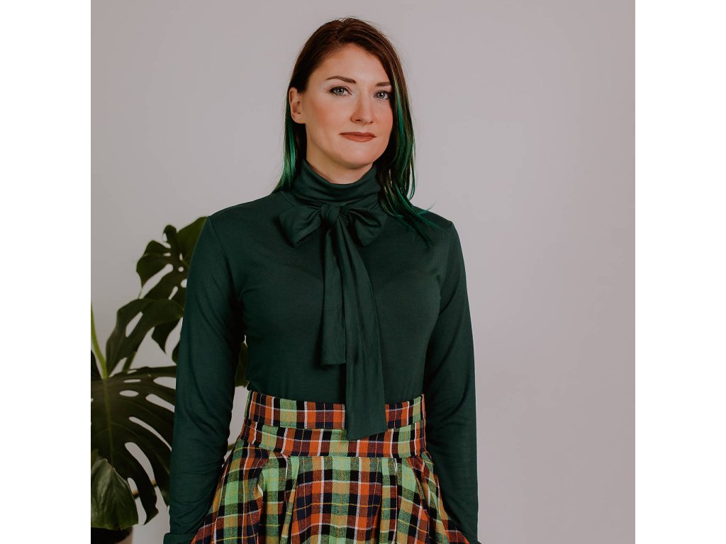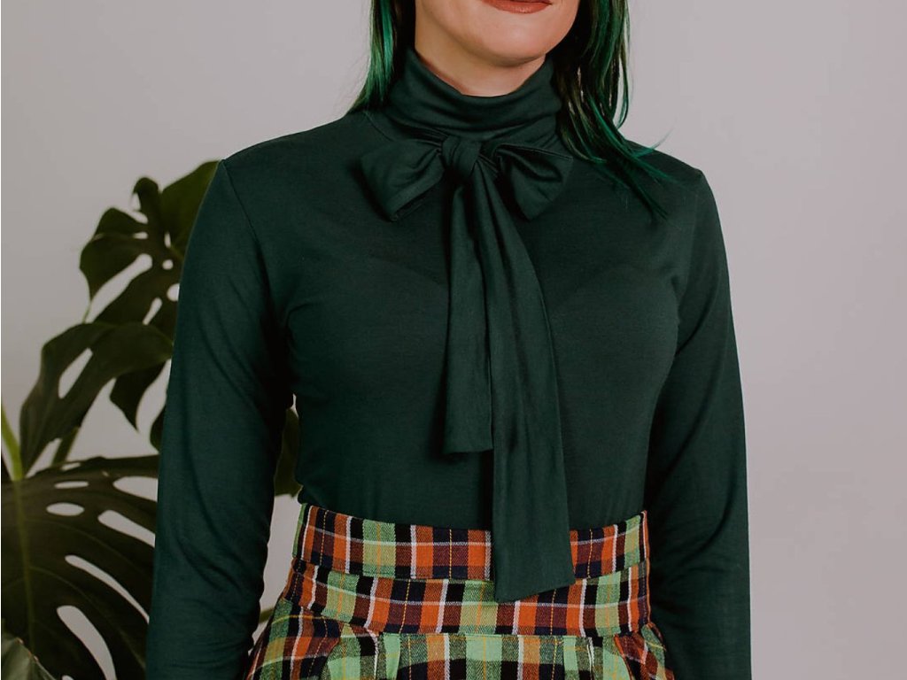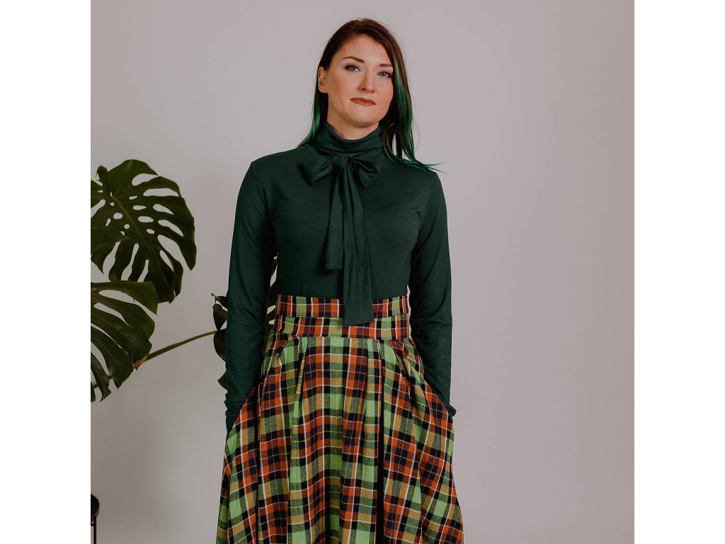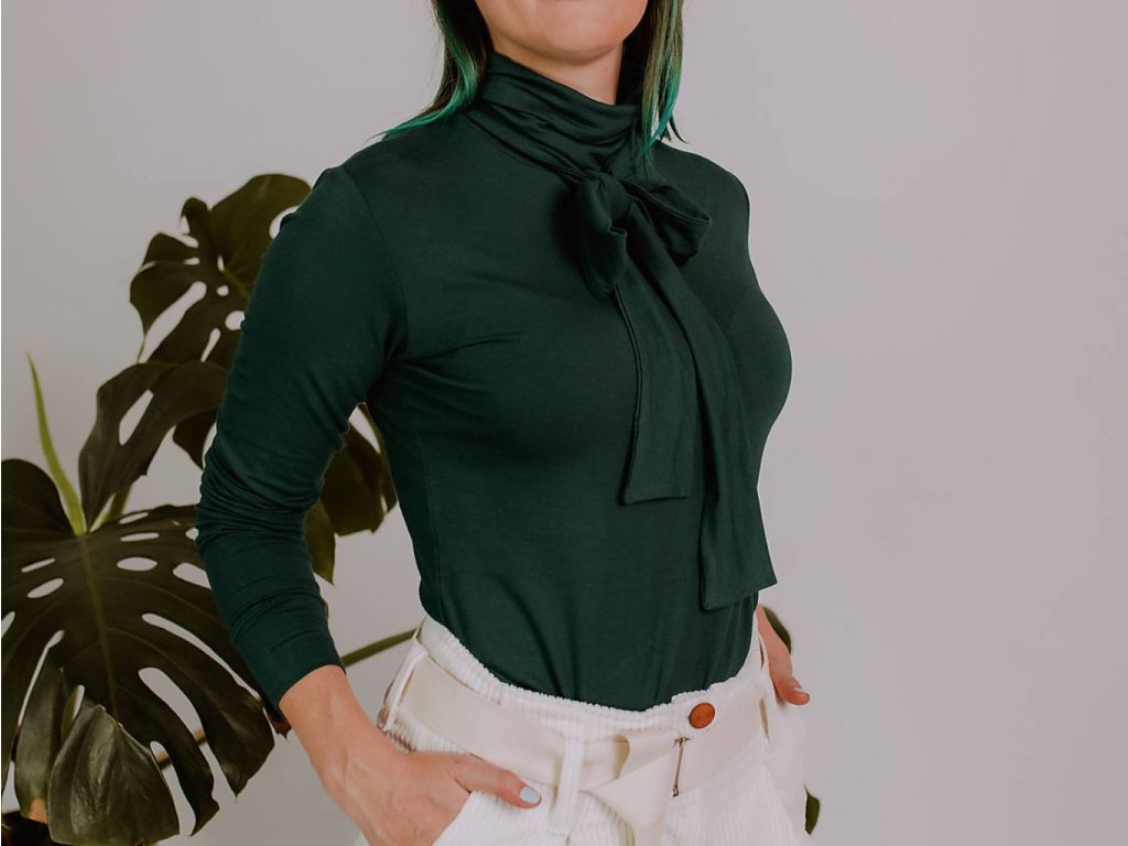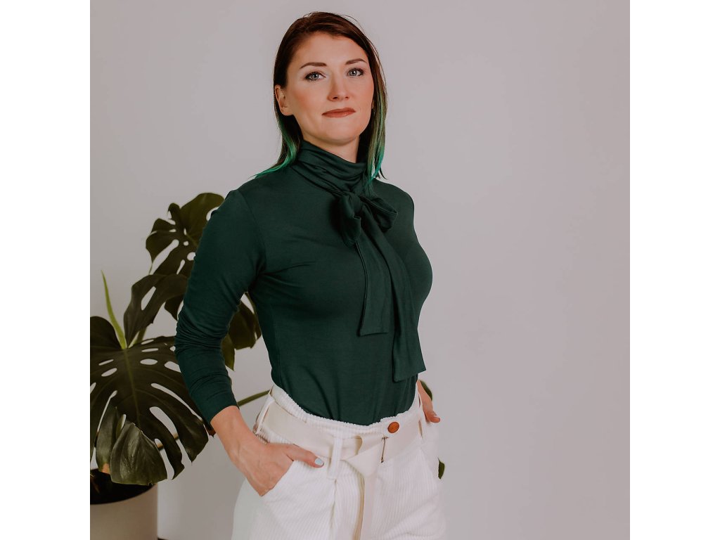 Tento dámsky elastický rolák, vyrobený na Slovensku, je dokonalým spojením pohodlia a elegancie. Jemný modalový úplet je mimoriadne príjemný na dotyk, priedušný a elastický, vďaka čomu je ideálny na každodenné nosenie. Má univerzálne ¾ rukávy a rolákový golier s ozdobnou viazačkou, ktorú môžete nosiť na viac spôsobov – ako mašľu, uzlík alebo voľne ako šál.